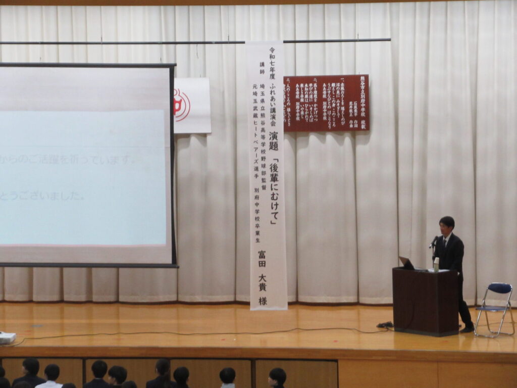 今年度のふれあい講演会は、別府中の卒業生であり、元埼玉武蔵ヒートベアーズ、現熊谷高校野球部監督の富田大貴先生をお招きし、講演いただきました。演題「後輩に向けて」では、富田先生の経歴を振り返りながら、これからの生き方として貴重なアドバイスをしていただきました。