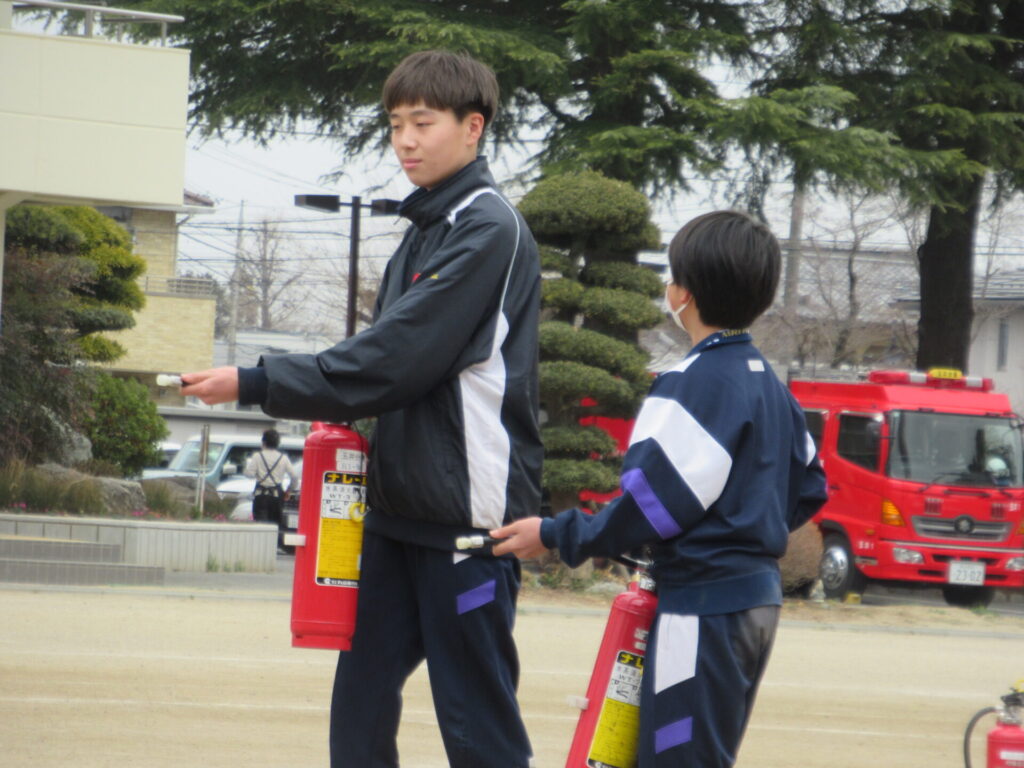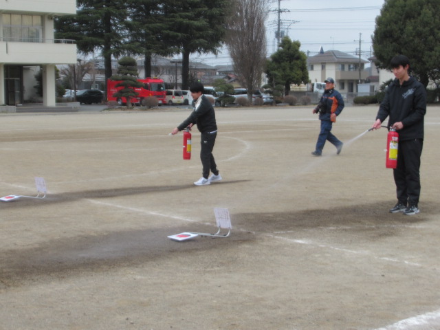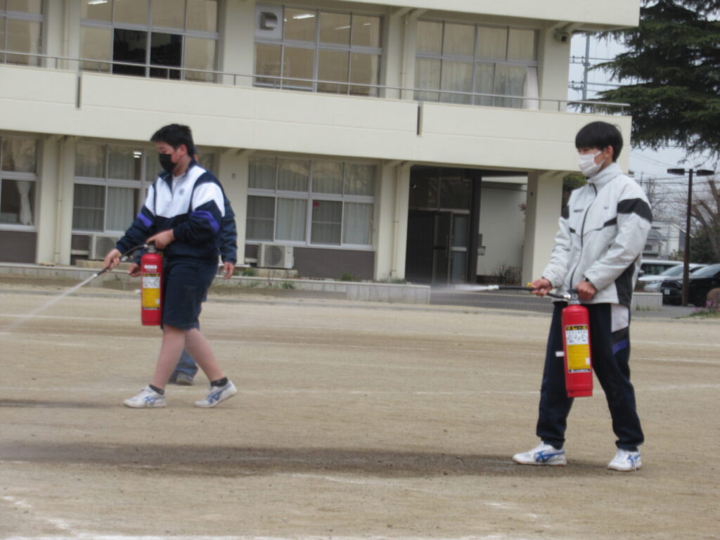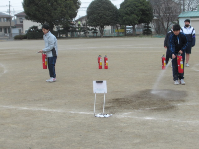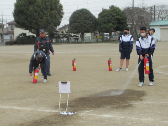 今回は学校内で火災発生というシチュエーションで実施し、熊谷消防署玉井分署の隊員の方をお招きしてご指導いただきました。
