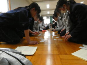 総合の時間に百人一首大会を開催しました。百人一首は札を並べるところから勝負は始まっています。自分の得意札は取れたでしょうか?